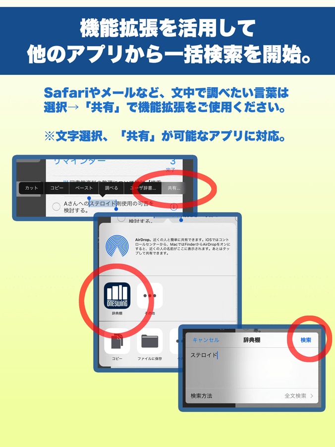 - 機能拡張により、Safari等他のアプリから辞書検索可能